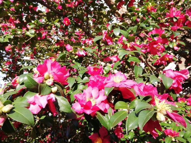 学内では、冬の澄んだ空気の中、山茶花の花が静かに咲いています。